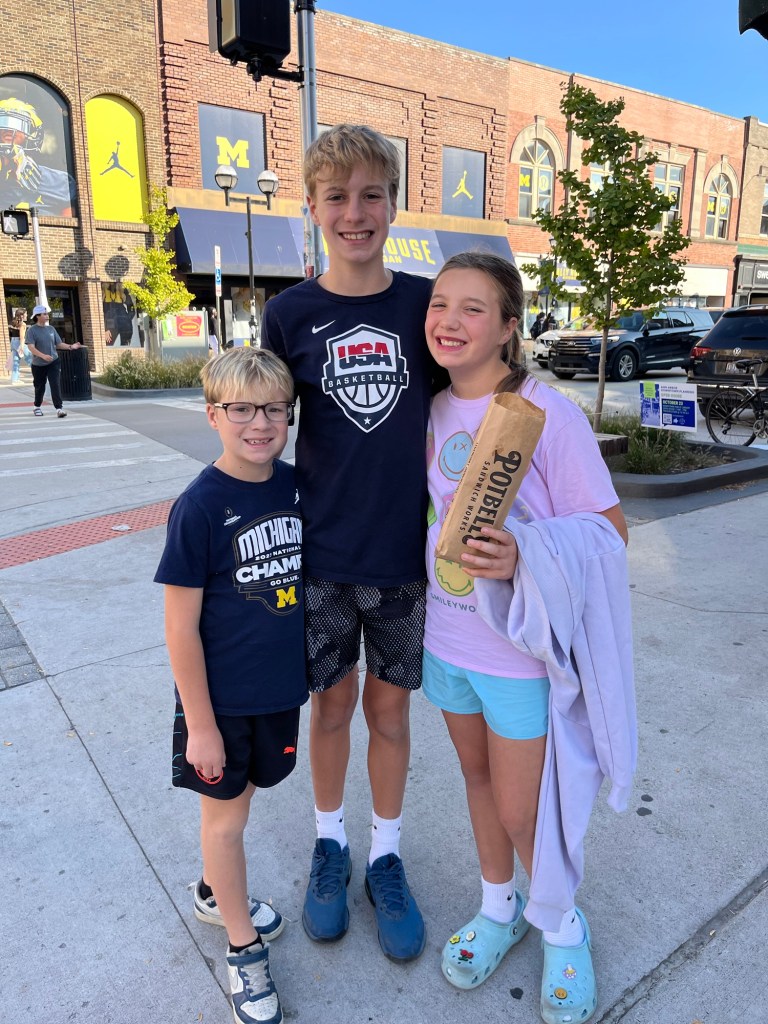 And overall, 2 out of the 3 kids were happy with what we were doing. There was always one kid, not necessarily the same kid, who was wanting to sit down or go back to our “house.” I’d like to think 2/3 is good. That is a 67% or a D+ in school and when I was a teacher, I liked to say D’s get degrees. I’ll give myself a passing grade. I know not everything was great on the vacation but I’m hoping my kids can remember it with good memories and a fun, new experience. At the end of our two full days in Toronto, my numb toes and heels were done with all the walking. My mind needed a break from constant cancer thoughts but my body betrayed me with struggling to walk. Towards the end of each day, I was seeking out a few more benches and resting areas along with one or two of the kids. On our drive home, Theo threw up in the car within the first 30 minutes of an 8 hour drive. So the drive could only go up from there. He was fine after that incident and when we stopped in Ann Arbor for a mid-day detour, he was thrilled to be at Michigan. Again, 2 out of 3 kids were excited to see the University of Michigan.